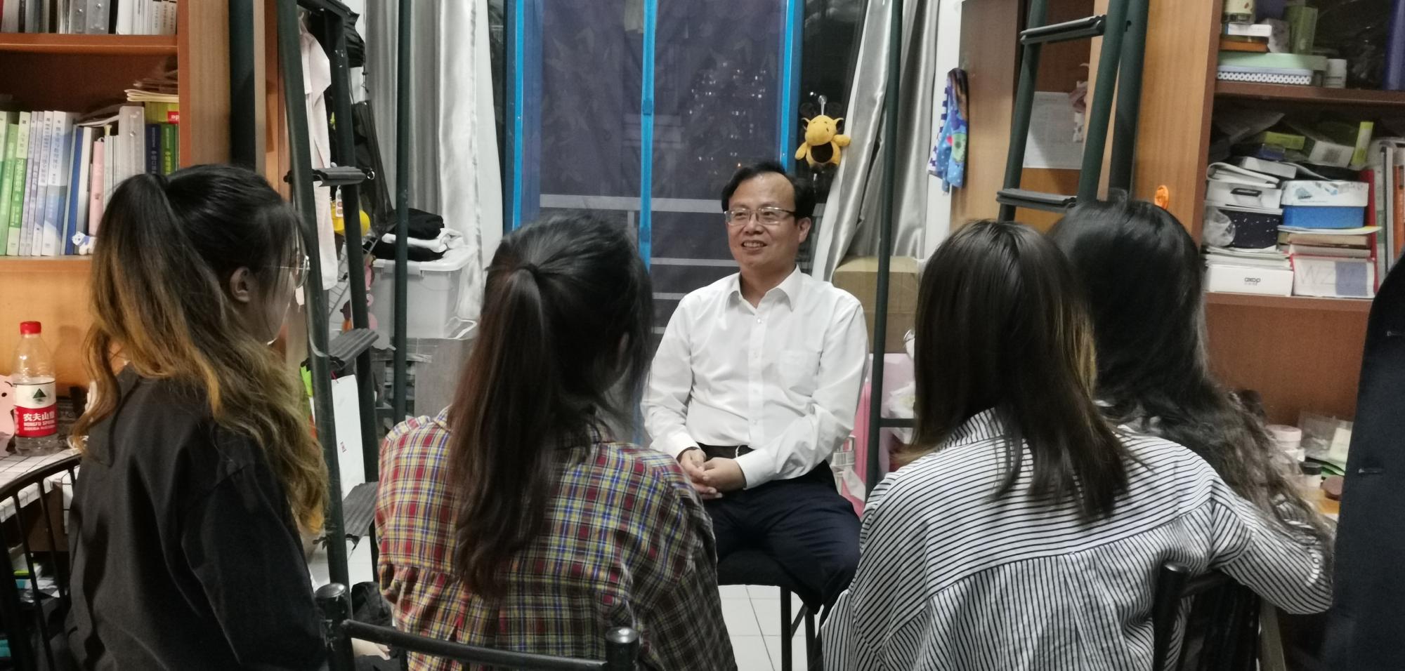 19幢521学生宿舍,并与17国贸1班学生进行了座谈交流。学院党委书记沈水法、副书记杨小恩陪同走访。