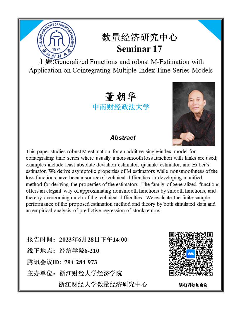 董朝华,中南财经政法大学统计与数学学院教授,主要研究领域为高维计量理论、非参数与半参数方法、非平稳时间序列和面板数据模型、微观计量应用,其研究成果发表在Journal of Econometrics、Journal of Business and Economic Statistics、Econometric Theory、《系统工程理论与实践》等国内外一流经济学期刊,主持多项自然科学基金,中国系统工程学会金融系统工程专业委员会理事,并担任Journal of Econometrics, Econometric Theory, Econometric Reviews, Annals of Statistics, Journal of Business and Economic Statistics等期刊匿名评审员。