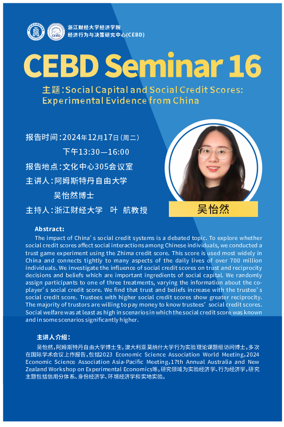 吴怡然,阿姆斯特丹自由大学博士生,澳大利亚莫纳什大学行为实验理论课题组访问博士,多次在国际学术会议上作报告,包括2023 Economic Science Association World Meeting,2024 Economic Science Association Asia-Pacific Meeting,17th Annual Australia and New Zealand Workshop on Experimental Economics等。研究领域为实验经济学、行为经济学,研究主题包括信用分体系、身份经济学、环境经济学和实地实验。
