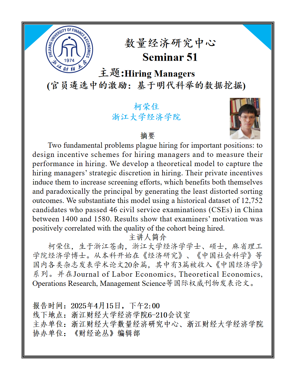 柯荣住,生于浙江苍南,浙江大学经济学学士、硕士,麻省理工学院经济学博士。从本科开始在《经济研究》、《中国社会科学》等国内各类杂志发表学术论文20余篇,其中有3篇被收入《中国经济学》系列。并在Journal of Labor Economics, Theoretical Economics, Operations Research, Management Science等国际权威刊物发表论文。