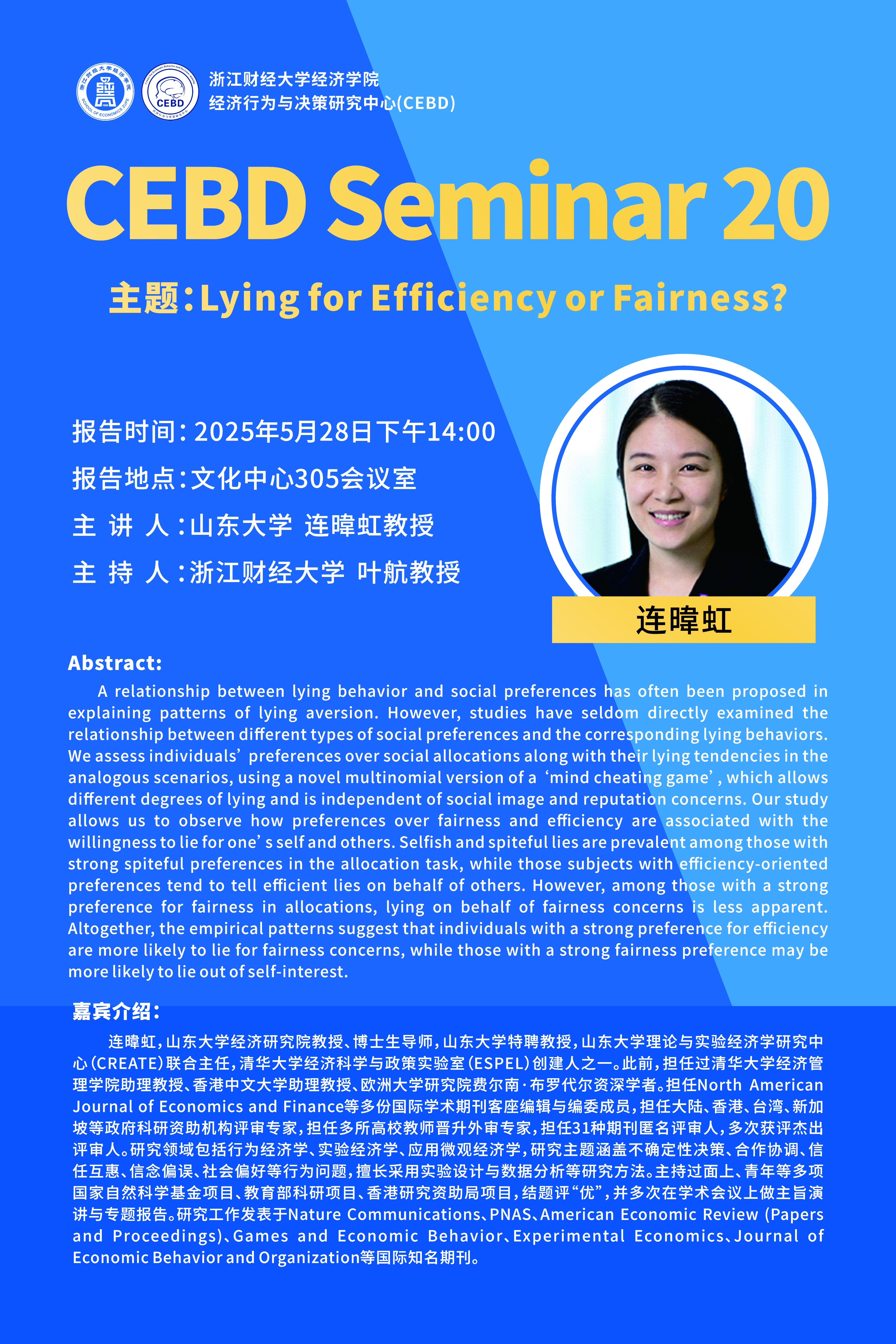 连暐虹,山东大学经济研究院教授、博士生导师,山东大学特聘教授,山东大学理论与实验经济学研究中心(CREATE)联合主任,清华大学经济科学与政策实验室(ESPEL)创建人之一。此前,担任过清华大学经济管理学院助理教授、香港中文大学助理教授、欧洲大学研究院费尔南·布罗代尔资深学者。担任North American Journal of Economics and Finance等多份国际学术期刊客座编辑与编委成员,担任大陆、香港、台湾、新加坡等政府科研资助机构评审专家,担任多所高校教师晋升外审专家,担任31种期刊匿名评审人,多次获评杰出评审人。研究领域包括行为经济学、实验经济学、应用微观经济学,研究主题涵盖不确定性决策、合作协调、信任互惠、信念偏误、社会偏好等行为问题,擅长采用实验设计与数据分析等研究方法。主持过面上、青年等多项国家自然科学基金项目、教育部科研项目、香港研究资助局项目,结题评“优”,并多次在学术会议上做主旨演讲与专题报告。研究工作发表于Nature Communications、PNAS、American Economic Review (Papers and Proceedings)、Games and Economic Behavior、Experimental Economics、Journal of Economic Behavior and Organization等国际知名期刊。