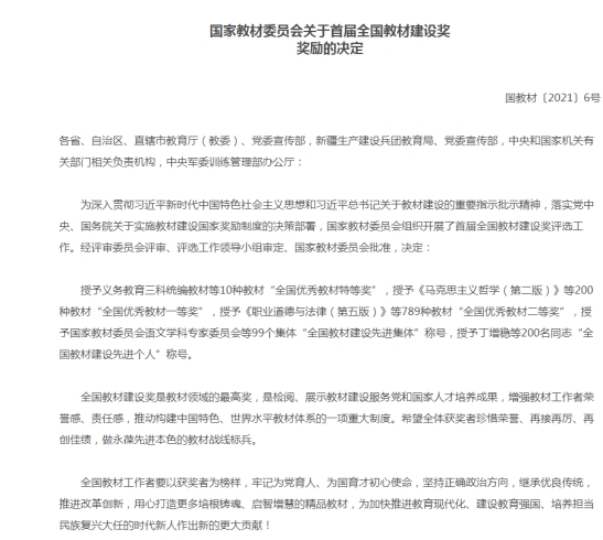 10月12日,国家教材委员会公布了首届全国教材建设奖评选结果,由啪啪啦