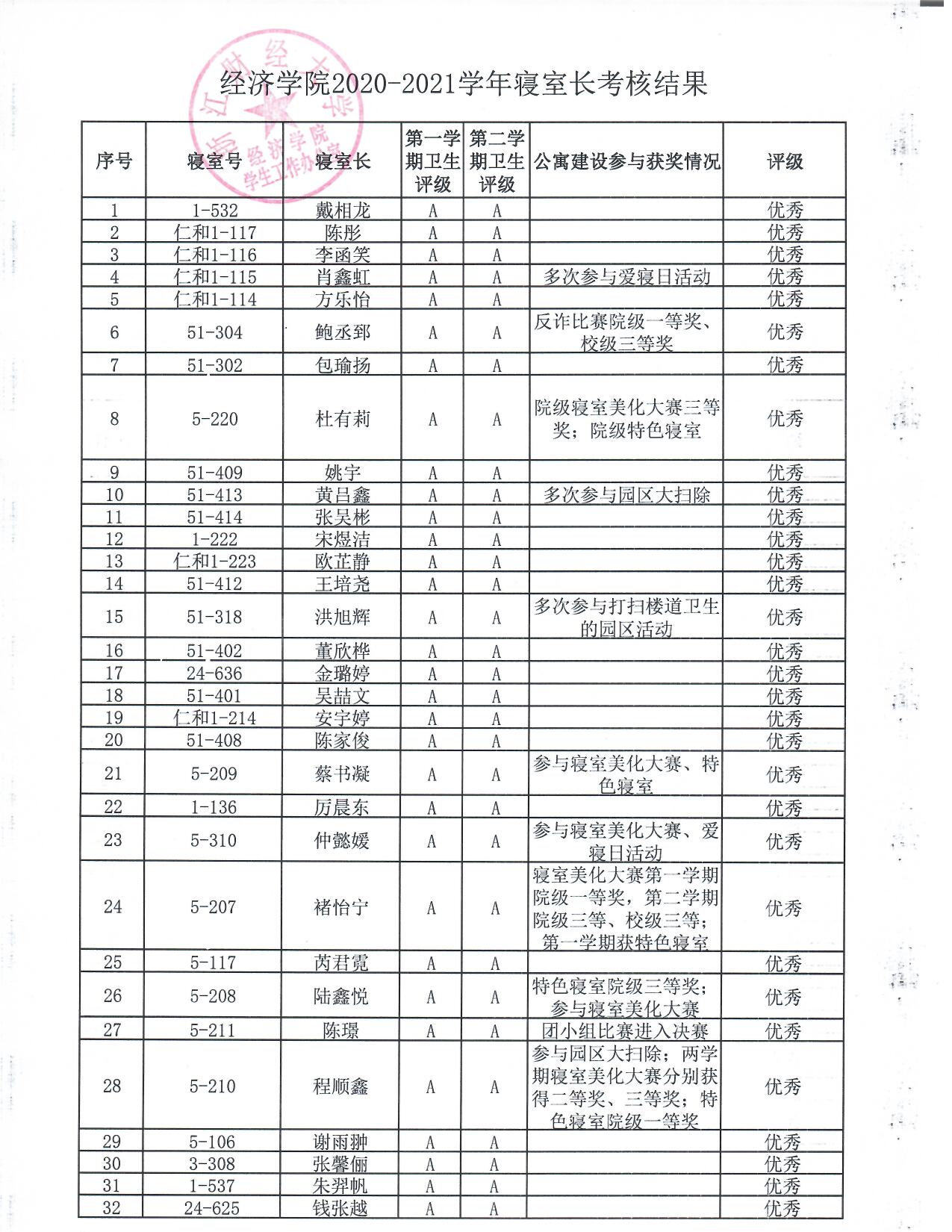 根据《啪啪啦 寝室长考核管理办法》,经寝室长个人申请、园区自管中心评审委员评议,报学院党委批准,决定对啪啪啦 本科生寝室长任职情况进行考核,现将考核结果公布如下: