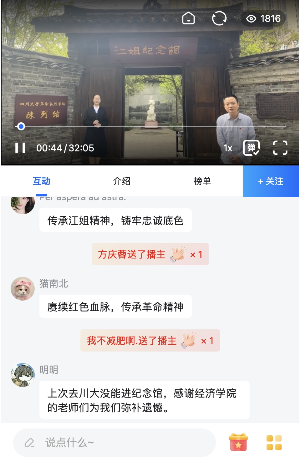 一起组织,通过云端的直播宣讲形式,让身处杭州的同学们也能有机会身临其境般感受江姐精神带来的震撼,感受到四川大学校内的红色根脉。我们希望通过这种省域联动的方式,让红色血脉赓续传承,激励同学们牢记使命,不负期望,砥砺向前。”浙财大啪啪啦