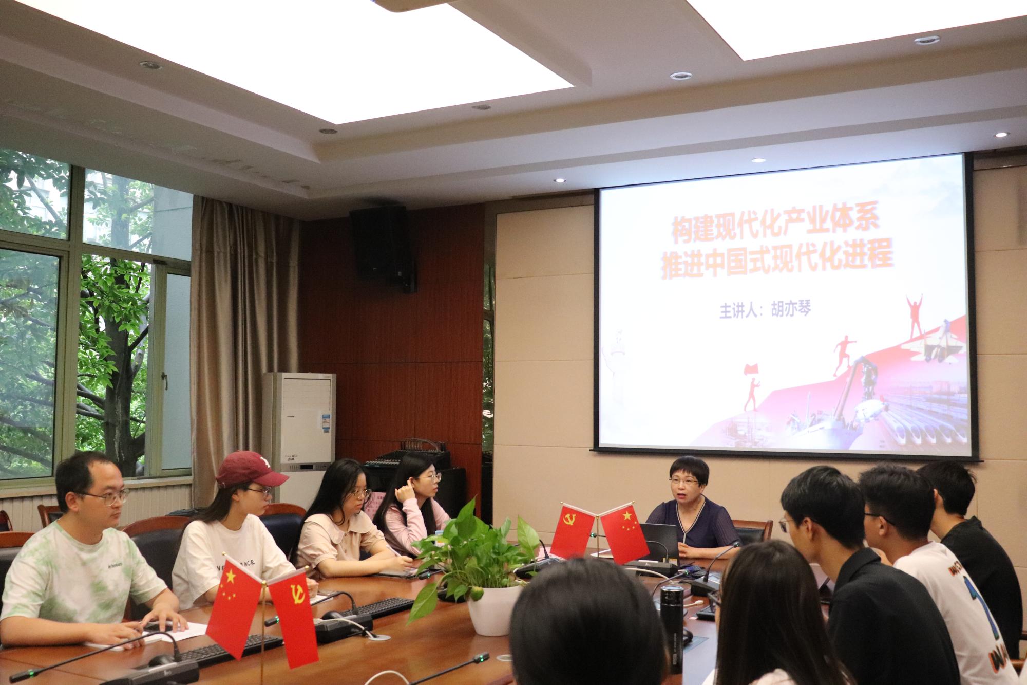 6月6日,党委书记胡亦琴以《构建现代化产业体系,推进中国式现代化进程》为题,为应用经济学学生第一党支部党员讲授专题党课。胡亦琴从中国式现代化、中国式经济现代化、建设以实体经济为支撑的现代化产业体系三个方面,层层递进系统地阐释了中国式现代化丰富内涵。胡亦琴指出,研究生党员同学要学好用好习近平新时代中国特色社会主义思想的世界观和方法论,做到带头学习、带头宣讲、带头研究。推进中国式现代化,是一项前无古人的开创性事业,是一个系统工程,需要统筹兼顾、系统谋划、整体推进,希望同学们勇担时代之责,将个人成长融入时代洪流,为以中国式现代化全面推进中华民族伟大复兴贡献浙财力量。
