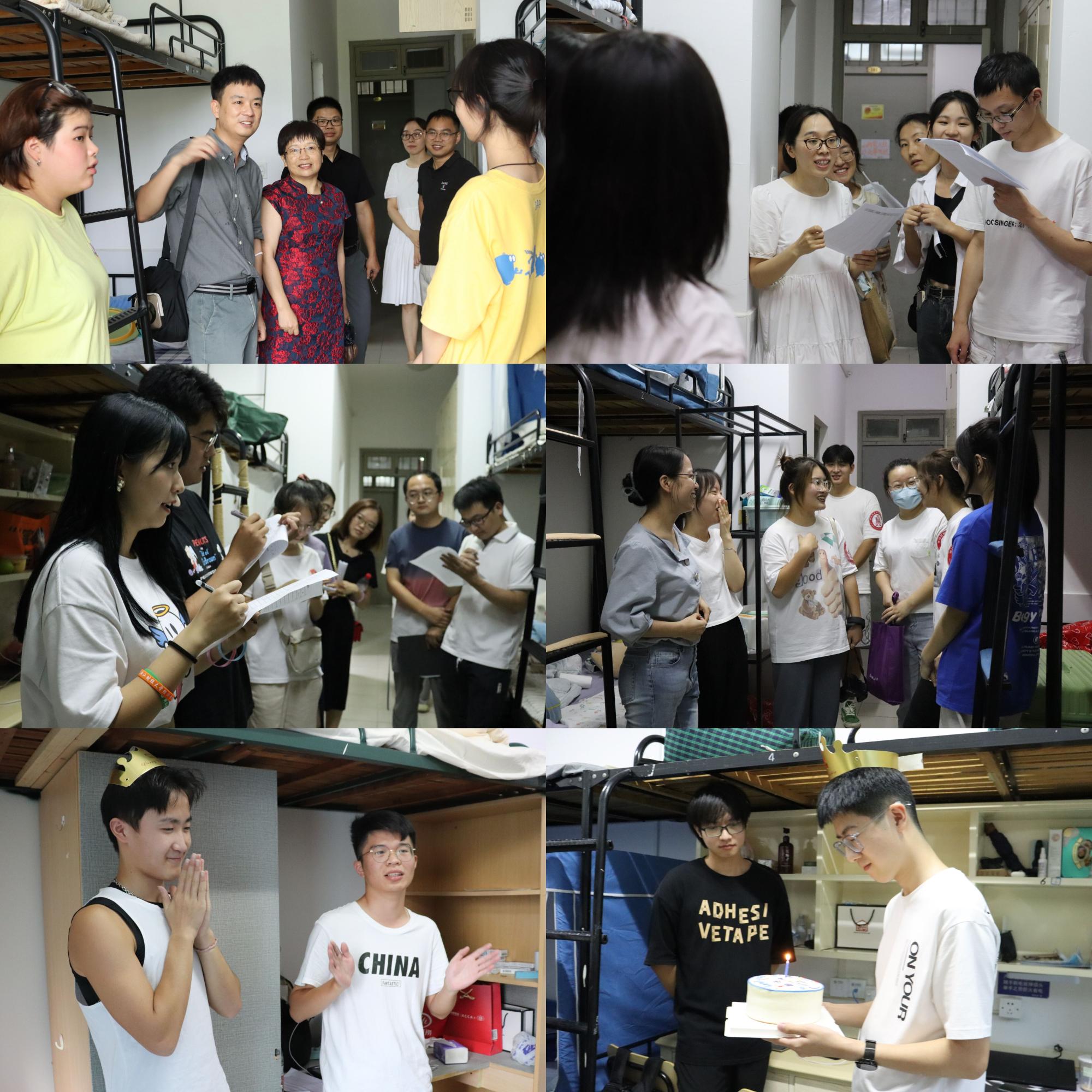 当天,学院全体领导班子、新生班主任、辅导员以及各班班导一行走访新生寝室,了解他们的生活情况,并叮嘱同学们调整作息,以良好状态迎接军训到来。师生还与当天过生日的两位新生共同庆祝,现场气氛温馨愉快。