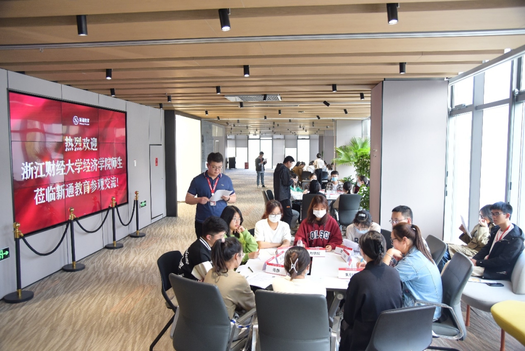 成功举办了“喜迎党的二十大,展望奋进新征程”企业游学活动。本次活动我们来到新通教育,依次开展了活动致辞、党支部交流分享、商科行业分享、无领导小组面试模拟实战和国际升学指导这五项活动,助力同学们更好地了解企业工作流程与行业发展现状,了解国际留学的现状,坚定理想信念,加强理论武装,提升浙财学子的综合素质。
