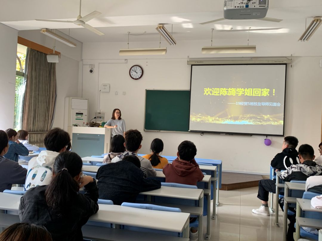 陈旖校友与19经贸5班学生合影
