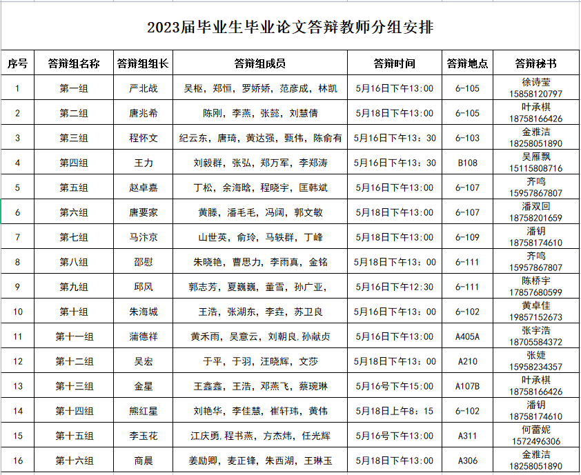 按照学校《关于2023届本科生毕业论文(设计)工作安排的通知》的要求,确保啪啪啦 2023届毕业生毕业论文开题答辩工作高效、有序开展,同时方便各答辩组教师灵活安排,学院决定采用分组、分时的方式进行开题答辩,拟安排在5月16日-18日进行毕业论文答辩。现将答辩教师分组及答辩时间公布如下: