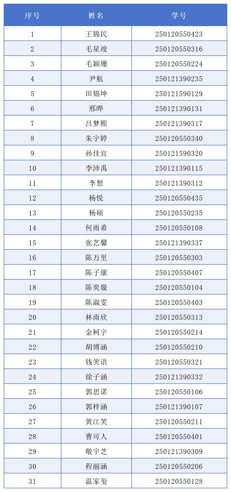2025级经济学拔尖学生培养基地班预录取以下31人(并列30名),现对预录取名单进行公示(按姓氏笔画排序)。